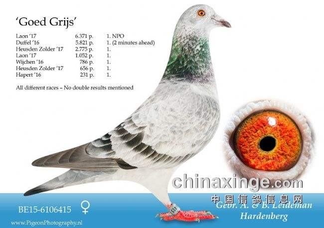 荷兰雷德曼兄弟的“好花”(Goed Grijs),环号:BE15-6106415,一羽漂亮的麒麟花黄眼雌鸽,由范登布兰德兄弟作育,荷兰雷德曼兄弟使翔。