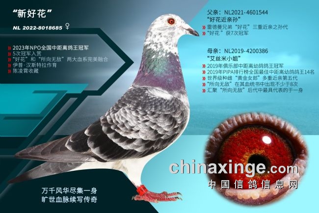 “好花”本身荣获7次速度赛冠军,后代获得2023年荷兰奥林匹克代表鸽G组冠军、2023年NPO、WHZB、TBOTB全国中距离鸽王冠军、2019年WHZB全国晚生鸽季后赛鸽王冠军。