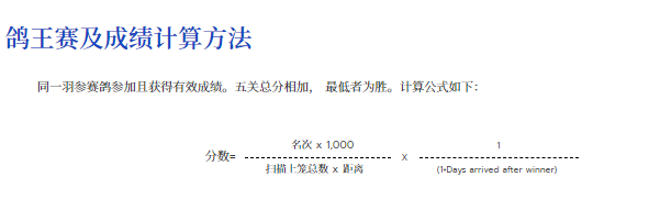 查看鸽王前10名的排名,阿联酋鸽友的AE23-1401173赛鸽,名次并不算太好,除了第一关获得48名外,其余四关均在100名开外,但五关总分相加最低,拿到鸽王总冠军。这样的鸽王冠军,含金量太低了?鸽王计算方法见图: