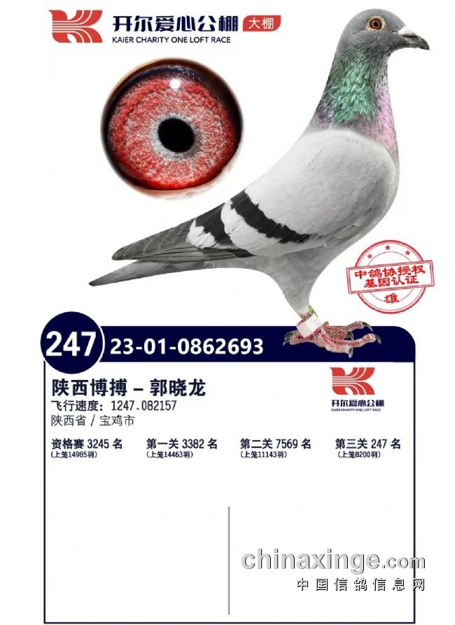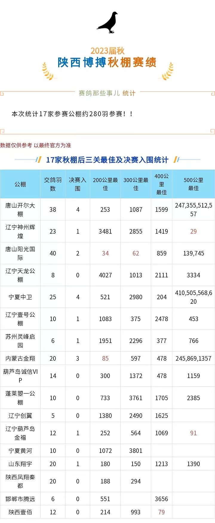 陕西博搏:17家公棚,交鸽羽数约280羽,决赛入围18羽。