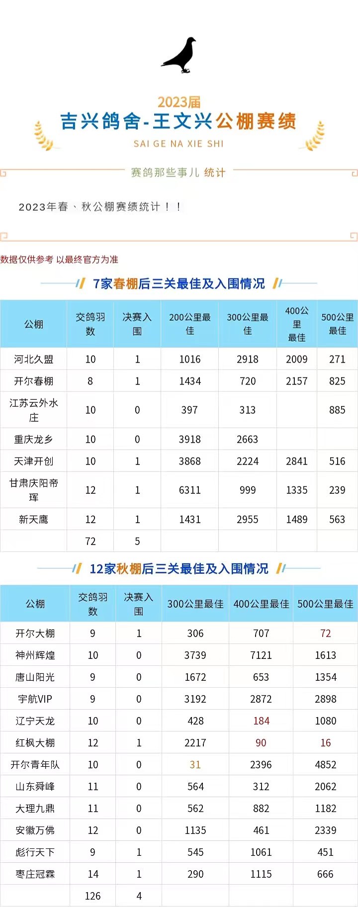 我们都知道,名家大户打比赛的优势是有优越的种鸽基础,以及大羽数交鸽。但也意外着要付出更高的成本,多交或者少交有不同的打法,也各有利弊。来看看陕西博搏和上海吉兴鸽舍和王臣几位大户的2023年秋赛战绩,你悟到了几分?(数据来源“赛鸽那些事儿”整理,仅供参考,具体以公棚数据为准)