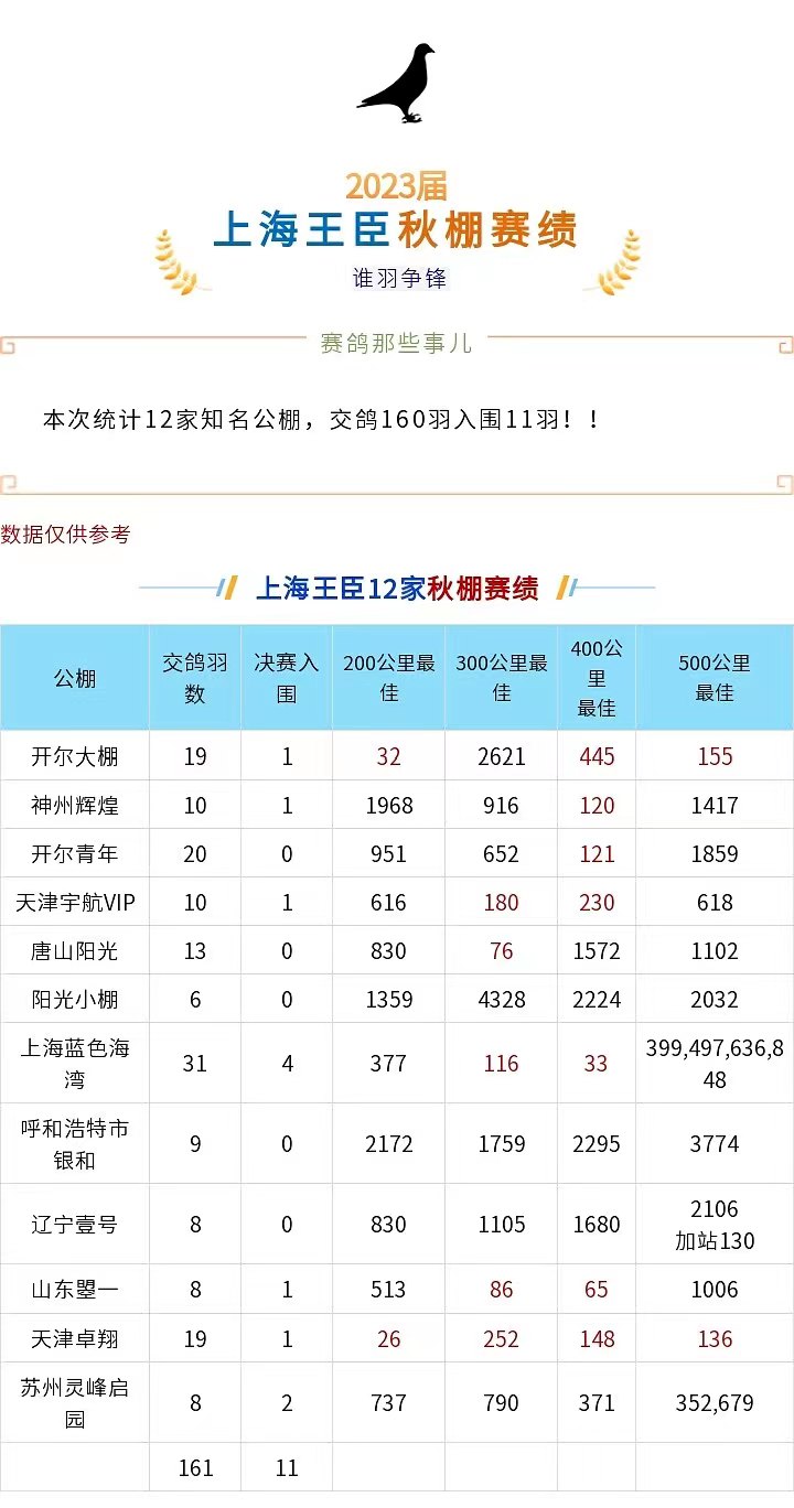 上海王臣:12家秋棚,交鸽羽数161羽,决赛入围11羽。