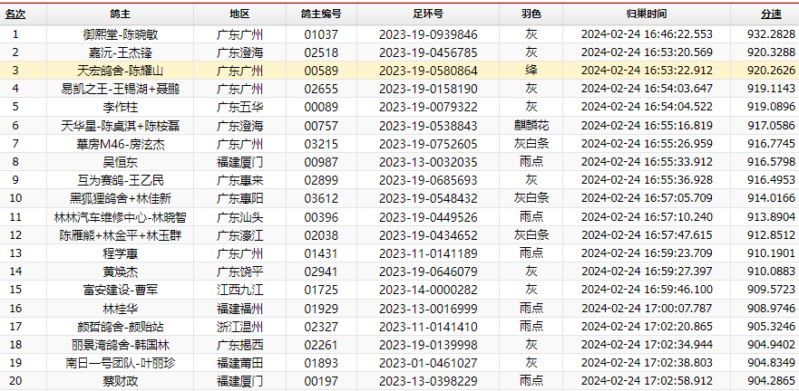 自1月23日打响第一关比赛,历时一个月,广东海翔春棚已结束四关比赛,2月24日上午7点50分第四关决赛鸣枪,空距500公里,上笼5242羽,最高分速为932.2828米/分,是御熙堂-陈晓敏名下赛鸽2023-19-0939846。第二名是嘉沅-王杰锋的2023-19-0456785,分速920.3288米/分。第三名是天宏鸽舍-陈耀山的2023-19-0580864,分速920.2626米/分。两日归巢2327羽赛鸽,归巢率44.39%。