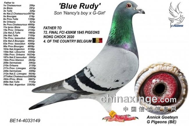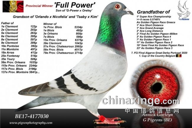 目前,安妮克·胡特森舍内的头号种公是“全动力full power”,足环号BE17-4177030灰鸽,主要是由盖比鸽系所组成,“闪电号”近亲X“白腹号”。