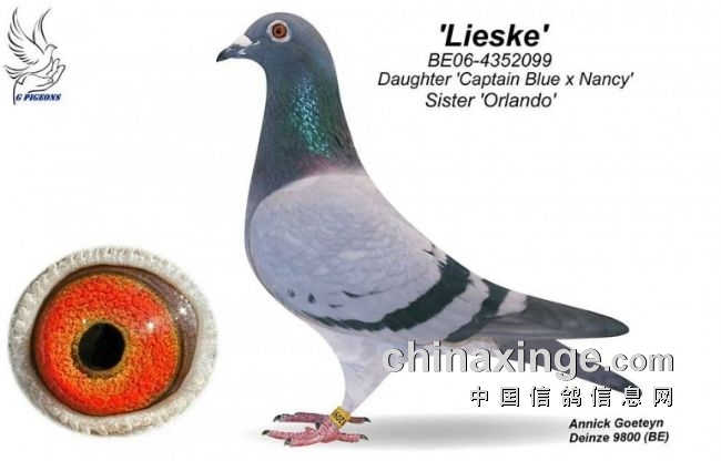 安妮克的鸽舍起源,来自传奇名家盖比·凡得纳比的一羽闪电号直子“灰船长”,这只05年“灰船长”,为安妮克作育出无数好鸽。安妮克指出:它是一羽体型大的鸽子,肌肉很强壮,翅膀也很强壮,耻骨密合。