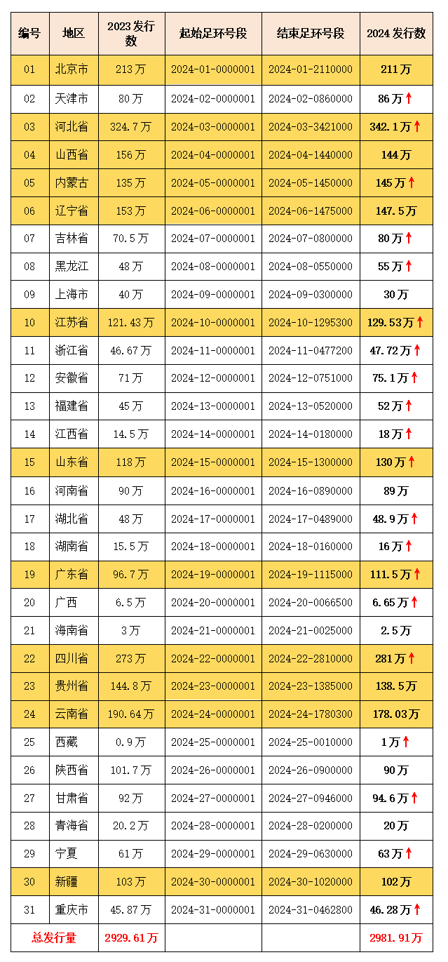 2023年百万大省同样是12个,不过,今年陕西省“掉队”,足环发行量减少11.7万枚,掉出百万大省之列。而广东省则增加14.8万,挤身12强。