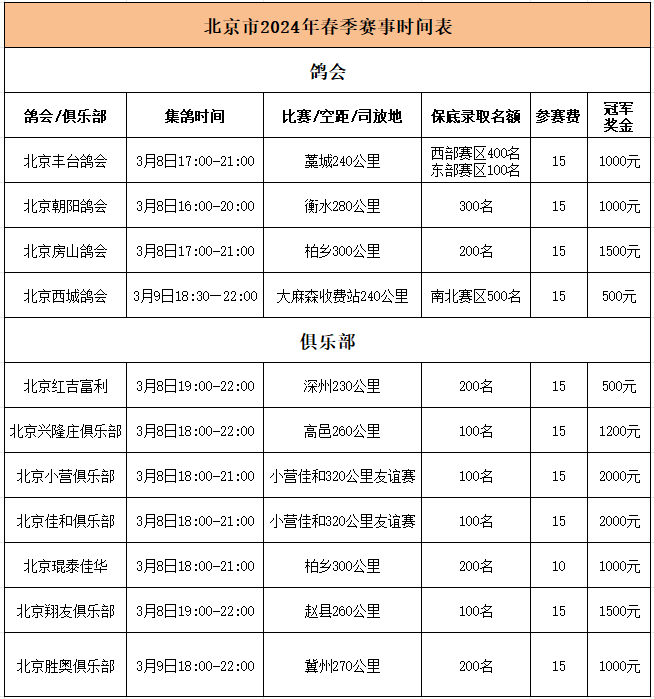 以下是赛事时间表汇总,仅供参考,请以鸽会俱乐部最新公告为主: