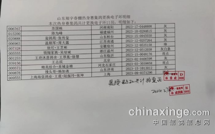 山东翔宇春棚2024年热身赛集鸽10796羽,于3月8日早上7:37在安徽泗县开笼,实际空距162公里,天气晴,赛鸽走势良好。比赛成绩直播>>