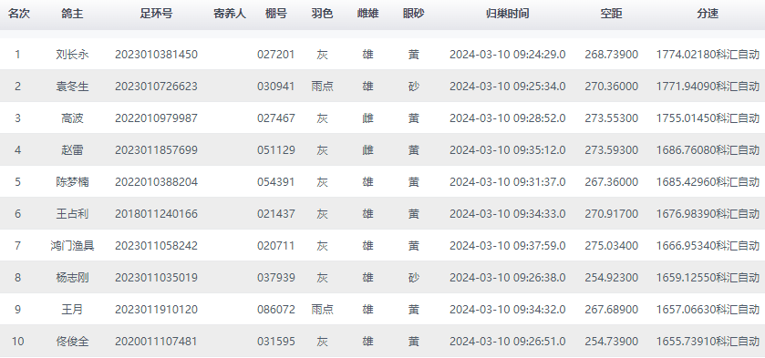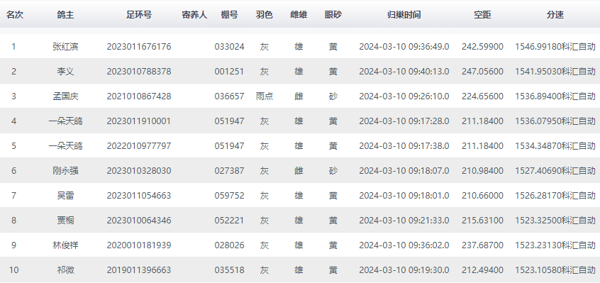 9点17分,首羽赛鸽踏钟报到,由于空距未能位列榜首。暂列第一的是张红滨的一羽黄眼灰雄鸽2023011676176,归巢时间为9点36分,空距242.599公里,分速1546.9918米/分。接着是李义的2023010788378和孟国庆的2021010867428,分速分别是1541.9503米/分、1536.8940米/分。截至上午10点30分,共计2419归巢羽赛鸽。