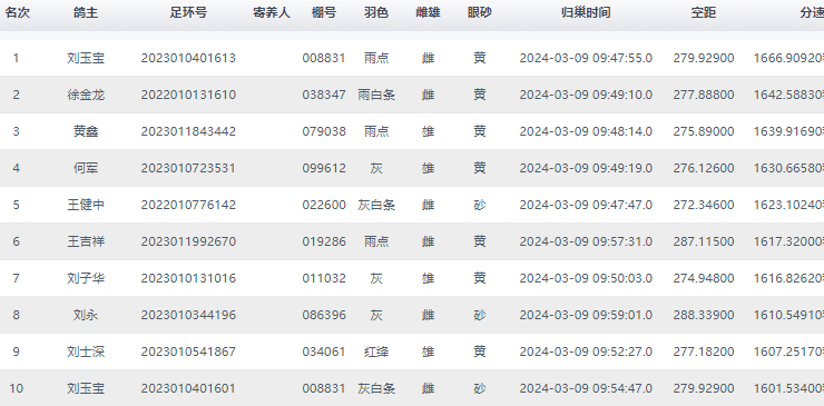 一羽环号为2023010401613的黄眼雨点雌鸽以1666.9092米/分的成绩排名第一,鸽主是刘玉宝,其名下还有一羽鸽子2023010401601排名第十,成绩1601.5340米/分。徐金龙的202201013610雨白条成绩为1642.5883米/分,排名第二。黄鑫的2023011843442雨点鸽成绩是1639.9169米/分,位列第三。