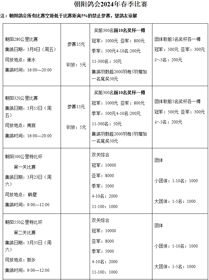 北京朝阳鸽会的春赛从3月9日开始打响,一个月内连打四场比赛,包含500、550公里春季特比双关赛。之后,4月份的大联赛时间待定。