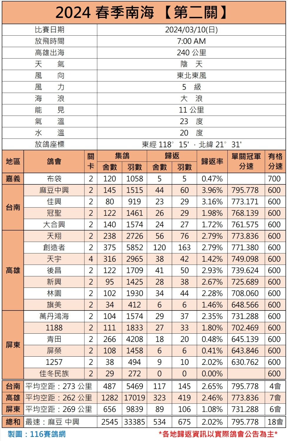 本场比赛,归巢情况不乐观,当日累计归巢675羽,归巢率仅2.02%,18个鸽会中,最高归巢率也只有3.96%,有一个鸽会直接灭关!单关冠军来自台南地区麻豆中兴鸽会,分速795.778米/分。另有四家鸽会的冠军分速不足650米/分,可见赛事之艰难。