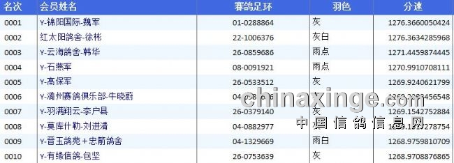 一个小时二十分,蔚蓝的天空就见一大群鸽子进入视线,犹如平时的家飞训练,落棚后纷纷通过扫描板计时,冠军分速1276.3660米/分,是一个典型的正常分速,锦阳国际-魏军01-0288864灰鸽获得第一名;四川红太阳鸽舍-徐彬22-1006376灰白鸽获得第二名;陕西云海鸽舍-韩华26-0859686雨点鸽获得第三名。
