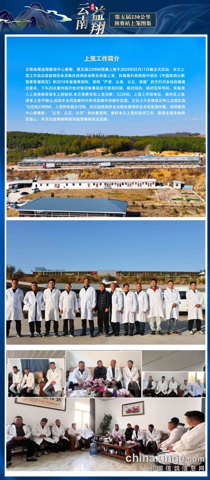 2、云南曲靖益翔赛鸽中心春棚第五届春赛,3月12日打响230公里预赛,比赛于早上8点06分在楚雄云甸工业园区放飞,有效上笼羽数5220羽。本场预赛录取前100名,前10名各发奖杯一樽,前三名各奖励1万元,其余均各奖励1000元。