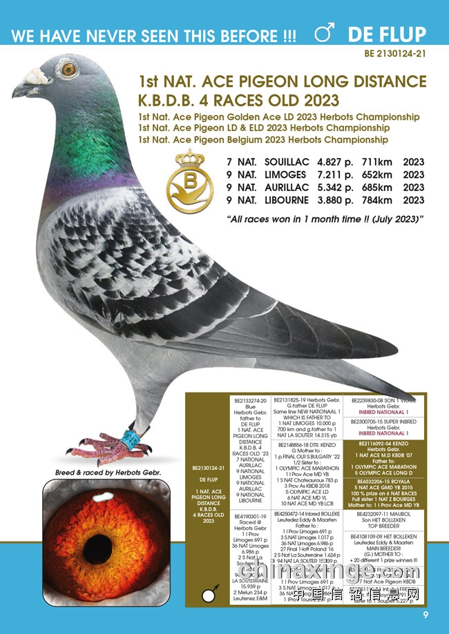 “菲利普”(De Flup),贺伯特兄弟鸽舍2023年的超级战将,环号B21-2130124,黄眼雨点雄鸽。在2023年7月份,这羽战将一个月内参加四场国家赛,均入围全国成鸽组前10名!