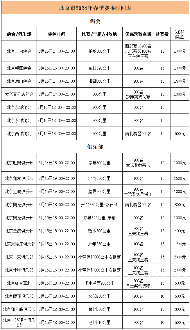 以下是部分赛事时间表汇总,仅供参考,请以鸽会俱乐部最新公告为准: