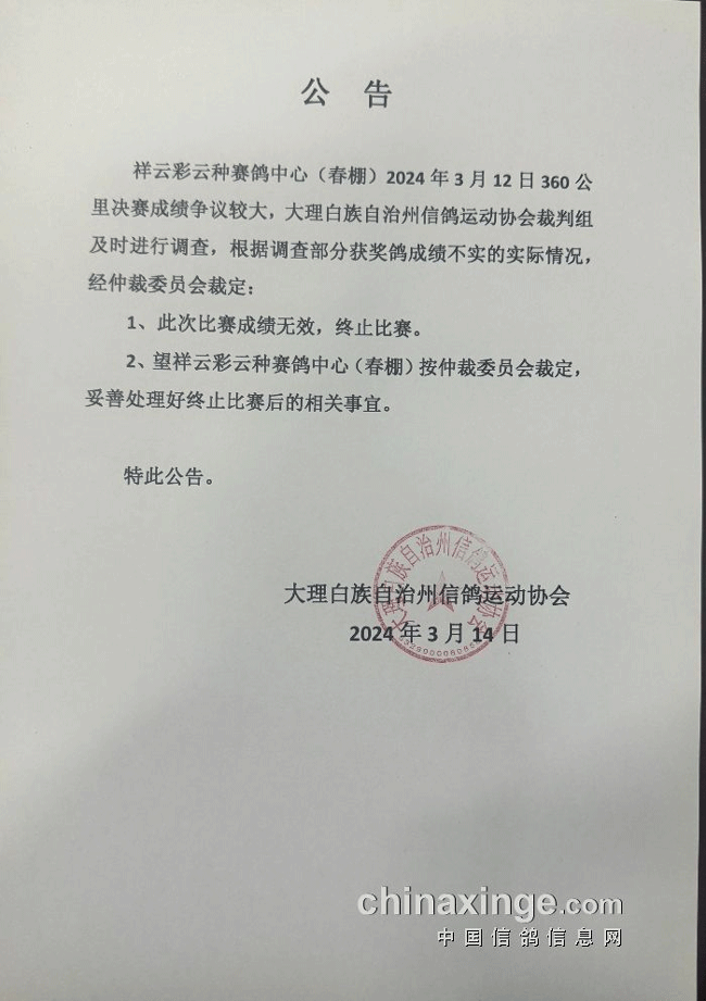 赛后,鸽友们对决赛归巢成绩提出了质疑,大理州鸽会裁判组进行了调查,根据调查部分获奖鸽成绩不实的实际情况,作出了此次比赛成绩无效,终止比赛的决定。