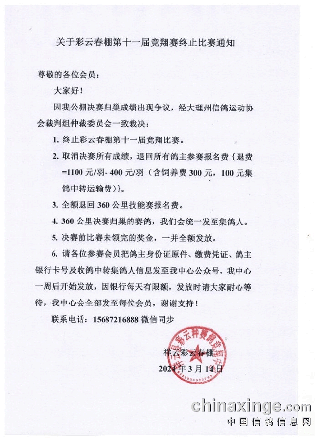 3月14日,公棚发布比赛终止通知,取消决赛所有成绩,退回所有鸽主参赛报名费(减去饲养费、集鸽中转运输费)。