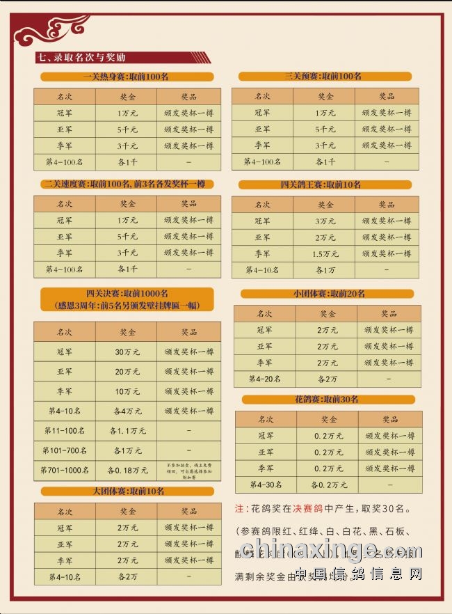 花鸽赛取前30名:冠军0.2万元颁发奖杯1樽、亚军0.2万元颁发奖杯1樽、季军0.2万元颁发奖杯1樽、第4-30名各0.2万元。