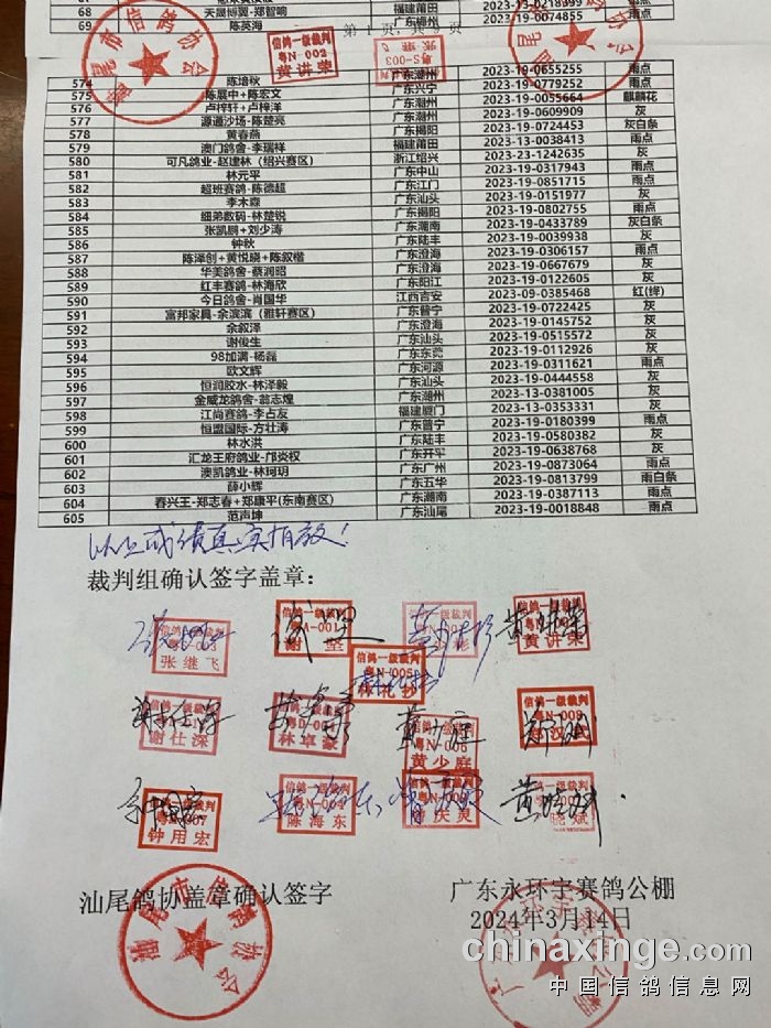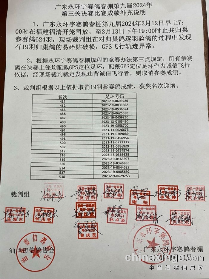 广东永环宇赛鸽公棚春棚第九届2024年第三关决赛比赛成绩补充说明