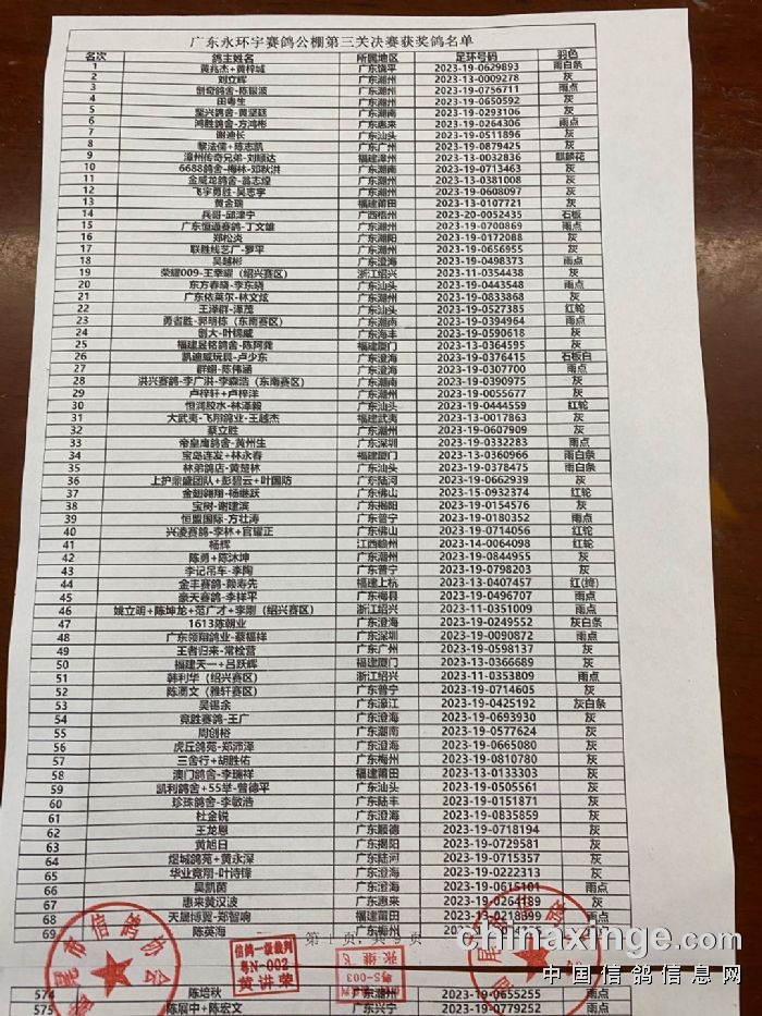 广东永环宇公棚(春棚)取消以下决赛归巢鸽成绩公告