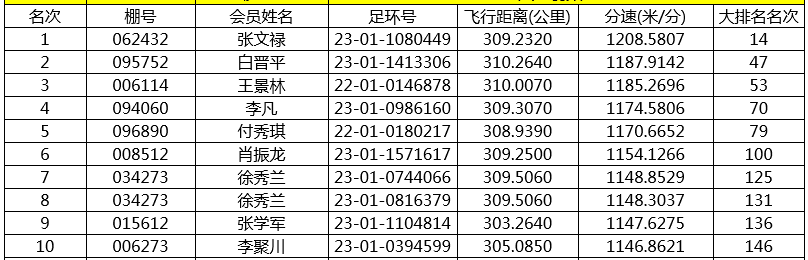 在东部赛区,张文禄的23-01-1080449赛鸽,飞行309.232公里,分速为1208.5807米/分,获得冠军,总排名14名。白晋平的23-01-1413306、王景林的22-01-0146878两羽赛鸽,分别获得东部赛区亚军、季军。