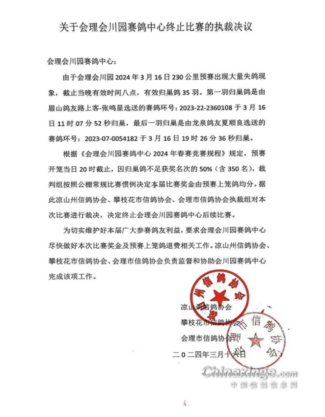 当天晚上,三家监赛鸽会联合发布执裁决议:由于出现大量失鸽,根据规程规定,预赛当天20时截至,因归巢鸽不足获奖名次的50%(含350名),裁判组决定本届比赛奖金由预赛上笼鸽均分,终止后续比赛。