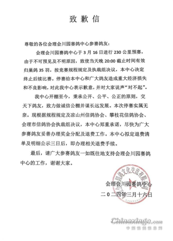 同时,公棚发布致歉信,由于不可预见及不明原因,致使预赛当天仅有效归巢35羽,比赛终止,给鸽友们造成重大经济损失表示歉意,并对大家说声“对不起。”