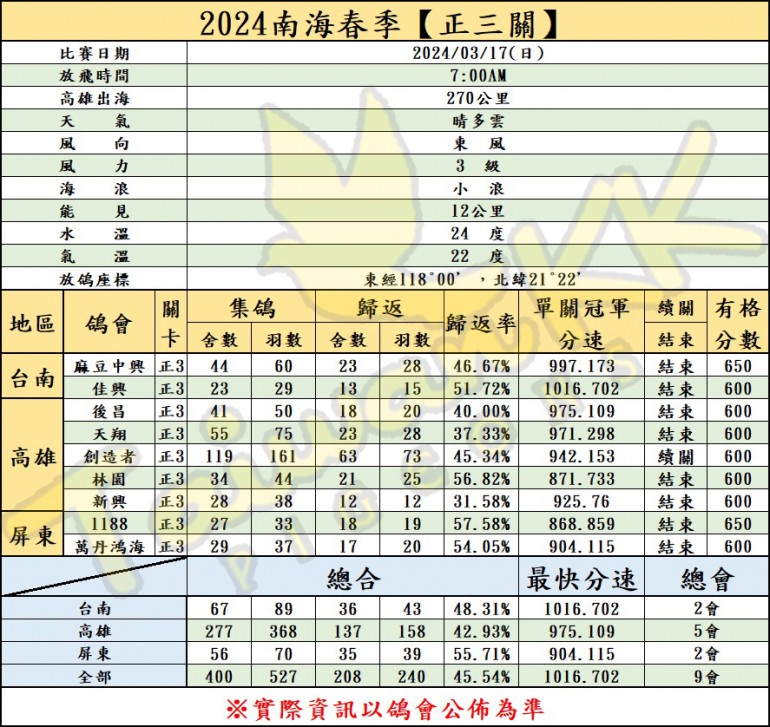 2024年中国台湾南海春季五关海翔赛,51412羽起站,3月10日18会的33385羽赛鸽参战,当日仅归巢675羽,归巢率仅2.02%,有鸽会直接灭关!