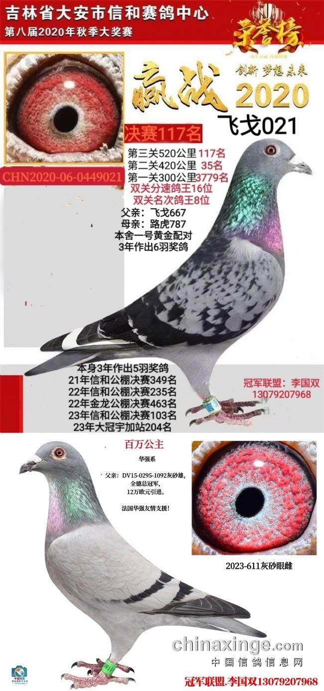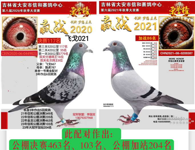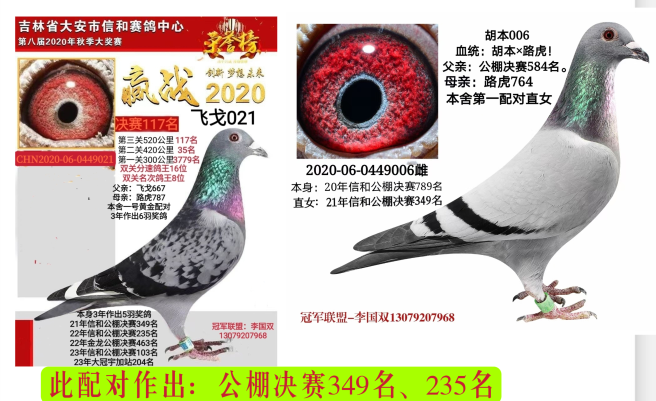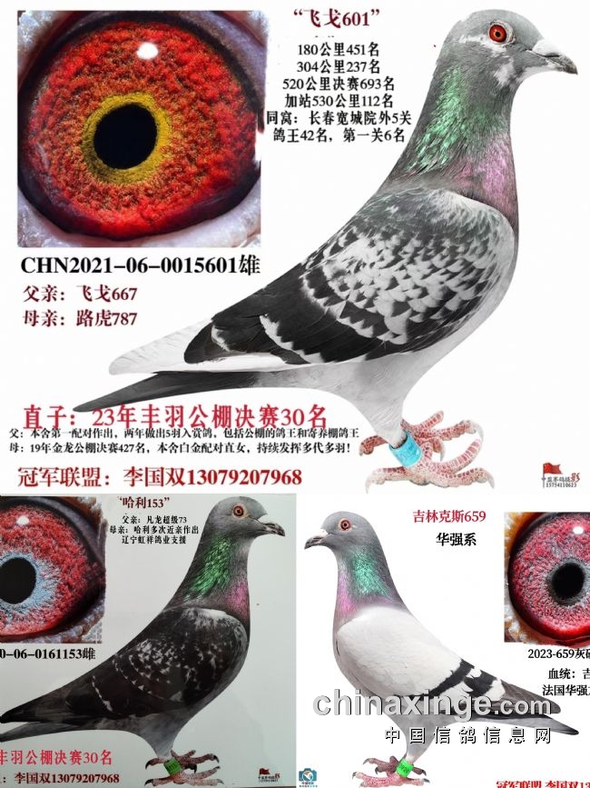 飞戈601,今年也采用一公配俩母的方式作育赛鸽,除保持原配对“哈利153”,还给601选配了一羽吉林克斯血系的“华强659”灰雌。