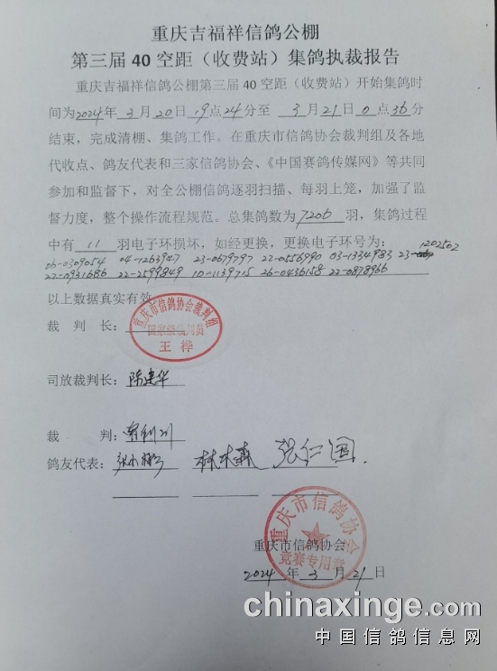 重庆吉福祥国际赛鸽公棚40公里清棚站比赛,于早上8点28分在川省南充市嘉陵区开笼放飞,共计集鸽7206羽。查看报到数据>>