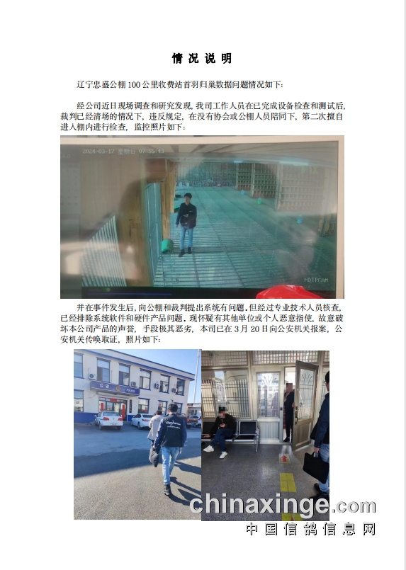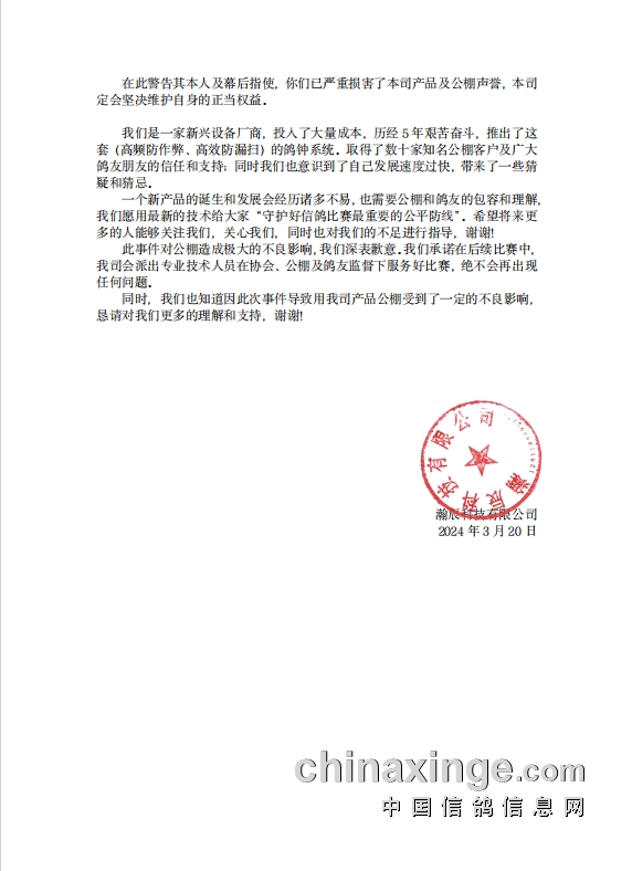 3月20日,公棚再发“关于100公里收费站首羽归巢数据情况说明”的公告,鸽钟厂商指出:经公司近日现场调查和研究发现,我司工作人员在已完成设备检查和测试后裁判已经清场的情况下,违反规定,在没有协会或公棚人员陪同下,第二次擅自进人棚内进行检查。并在事件发生后,向公棚和裁判提出系统有问题,但经过专业技术人员核查,已经排除系统软件和硬件产品问题,现怀疑有其他单位或个人恶意指使,故意破坏本公司产品的声誉,手段极其恶劣,本司已在3月20日向公安机关报案,公安机关传唤取证。