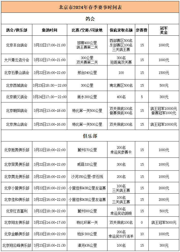 此外,3月22日晚上集鸽,23日放飞的丰台、大兴鸽会,佳和小营俱乐部的免费中短距离鸽王赛进入到第二关的比拼,以及西城、石景山、顺义等鸽会俱乐部多场300公里级别的短距离速度赛,名家、大户、工薪同场竞技,且看谁能独领风骚。