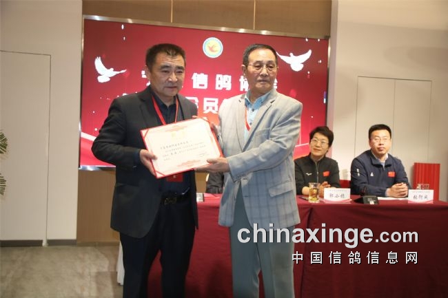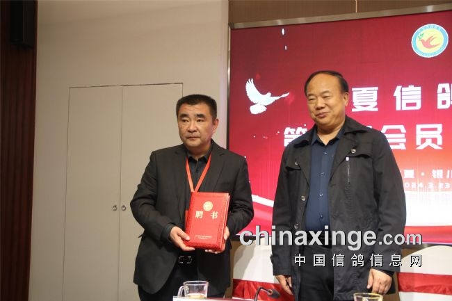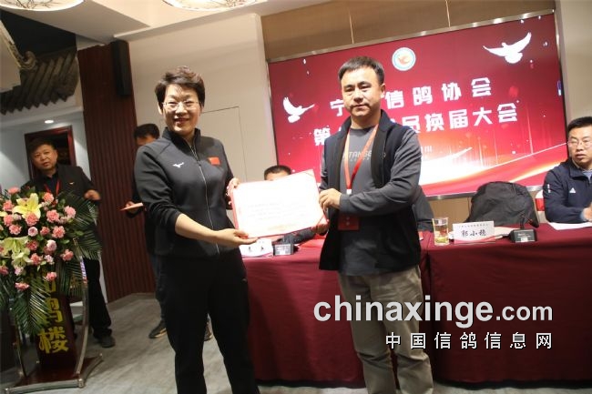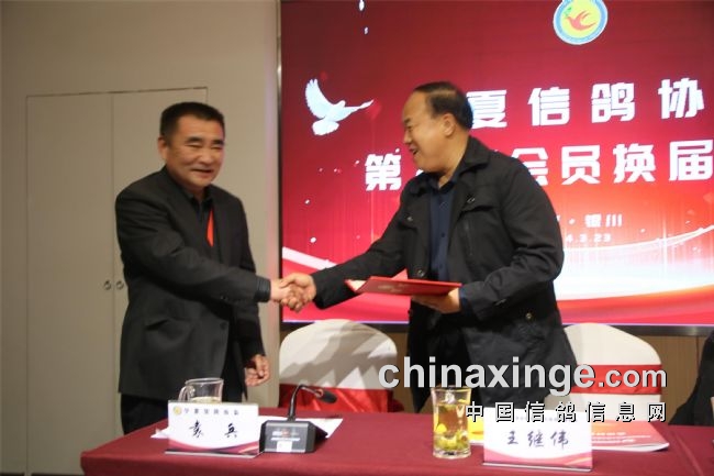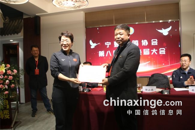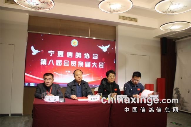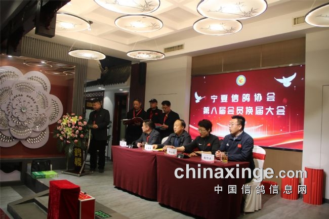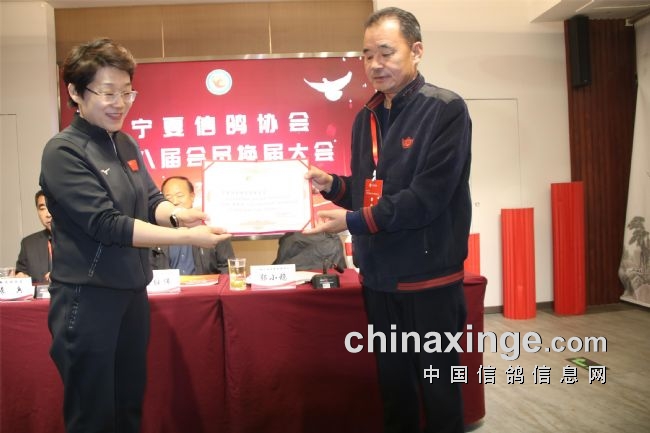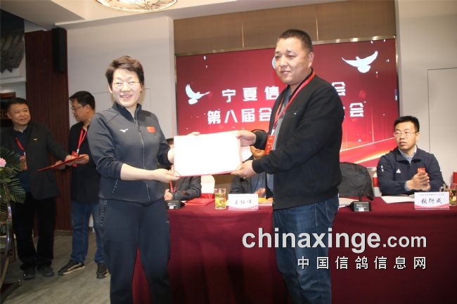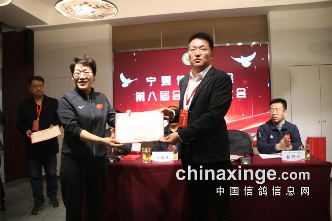 郭小稳宣读了社会体育中心有关第八届换届工作的批复;袁兵作了上届鸽会工作报告,报告结束,全场会员审议通过了第七届宁夏信鸽协会主席袁兵向大会所做的《宁夏信鸽协会第七届委员会工作报告》;区鸽协专职会计师张海燕宣读了历年来的财务工作报告,受到了全体会员的掌声通过。第七届副会长李振清宣读了大会流程。副会长姚刚、马晓军先后宣读了理事会、监事会候选人名单。监票组由马威、程新、胡林三人担任。马威宣读了选票结果名单,会员代表61人,59人参加选举大会,有15人当选理事会理事。袁兵当选第八届信鸽协会会长,理事会副会长选举采取差额无记名投票方式产生,最后由得票最多的前5名当选,他们是:马平、李振清、姚刚、马晓军、周学文。尚际辉当选为第八届信鸽协会秘书长。原副会长、中国信鸽协会终身成就奖获得者康健被骋为宁夏信鸽协会顾问,由会长袁兵颁发了证书。自治区民政厅社会组织管理局王继伟向袁兵颁发了会长证书。社会体育局中心主任郭小稳,向五位副会长和秘书长颁发了证书。