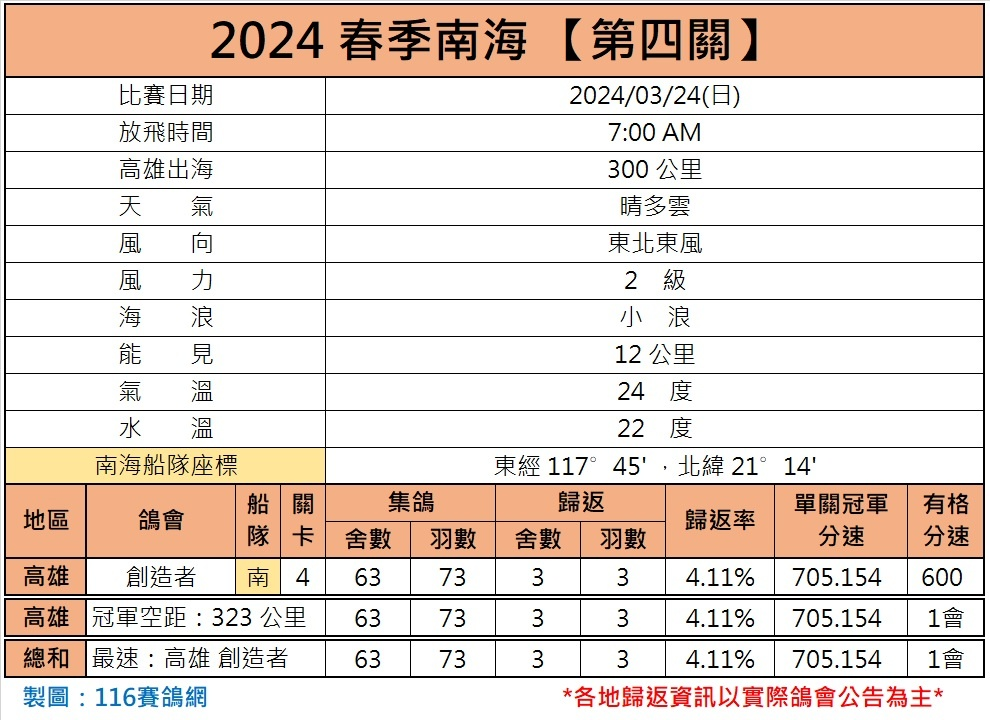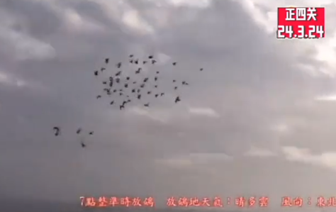 2024年中国台湾南海春季五关海翔赛,51412羽起站,打到第四关正赛全船仅剩创造者鸽会73羽。3月24日上午7点整,这73羽“淘”出的精英从300公里外的海平面出发,开始新一轮挑战。司放地东经117º45´、北纬21º14´,当天晴多云,有2级东北东风,小浪,能见度12公里,水温、气温分别达到22度、24度。