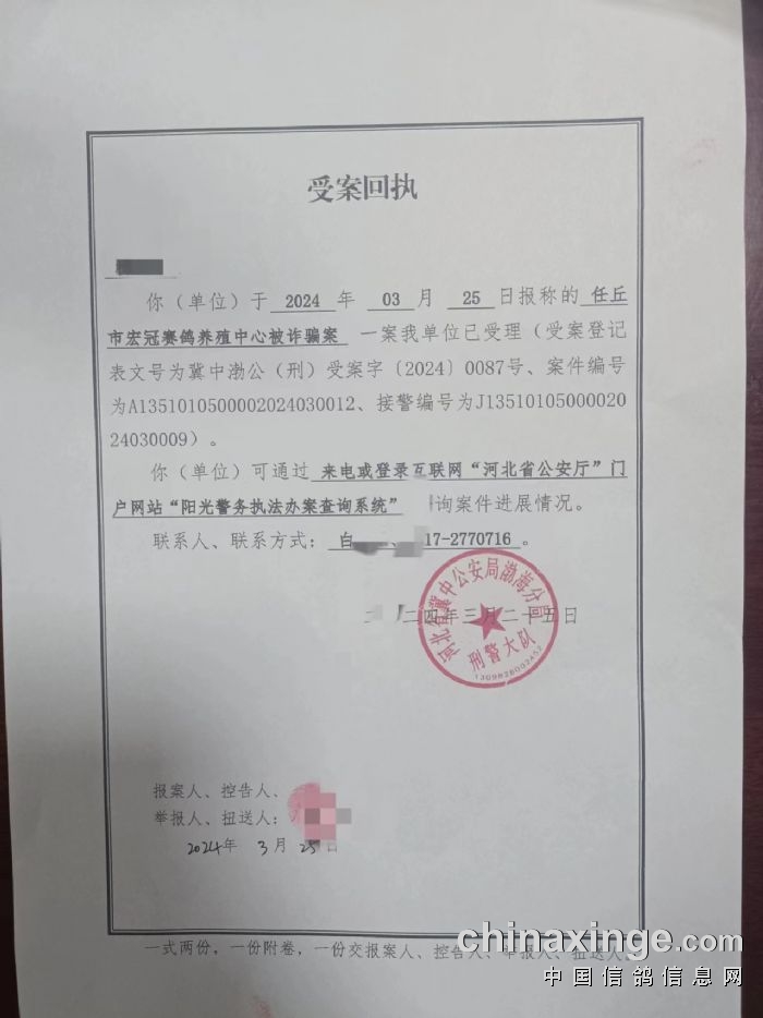 2、天下鸽友是一家,净化赛鸽运动比赛环境是每个养鸽人的期待,河北宏冠春棚以最大的决心和信心打响了今春“打假”的第一枪,希望得到全国各界同仁的支持和帮助,特向广大鸽友及知情人士广泛征集相关线索,凡提供重要线索的鸽友请联系公棚或办案单位,经办案机关查证属实的,我棚将予以重奖。
