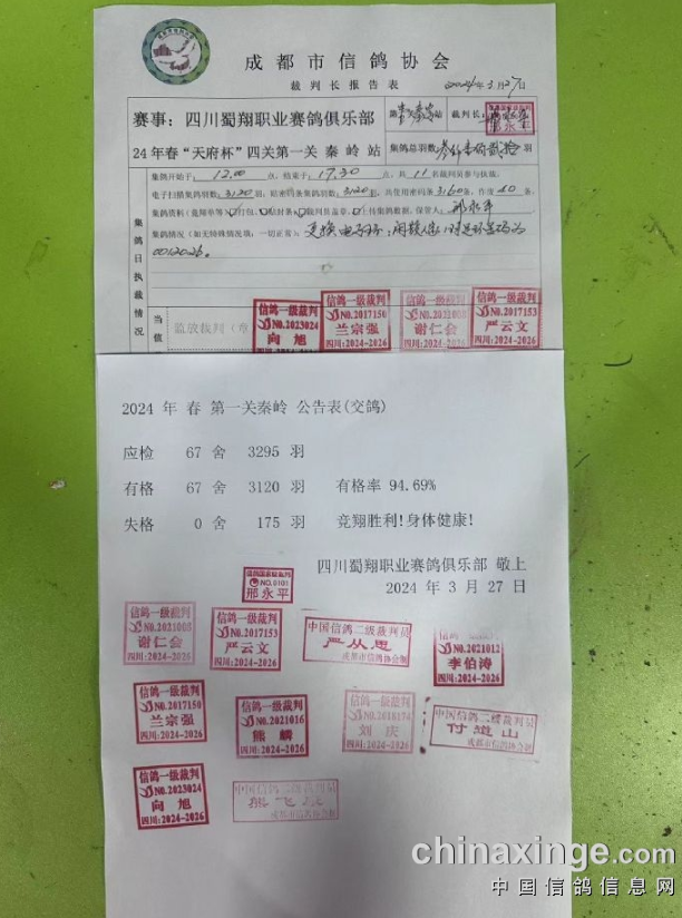 本次比赛共四关,第一关秦岭站、第二关宁陕站、第三关平凉站、第四关佛坪站,空距在450-560公里,预计于4月中下旬打完。3月17日进行120公里资格赛,在江油北放飞67舍3445羽赛鸽,冠军分速1417.71983米/分,归巢率95.65%。
