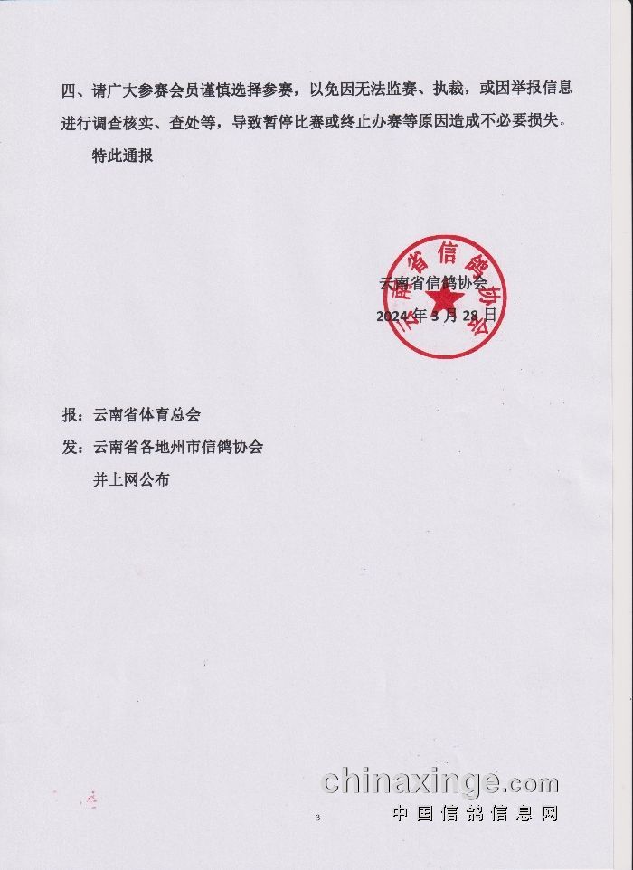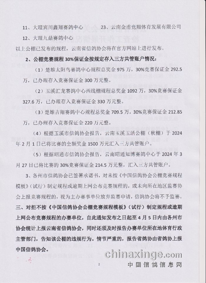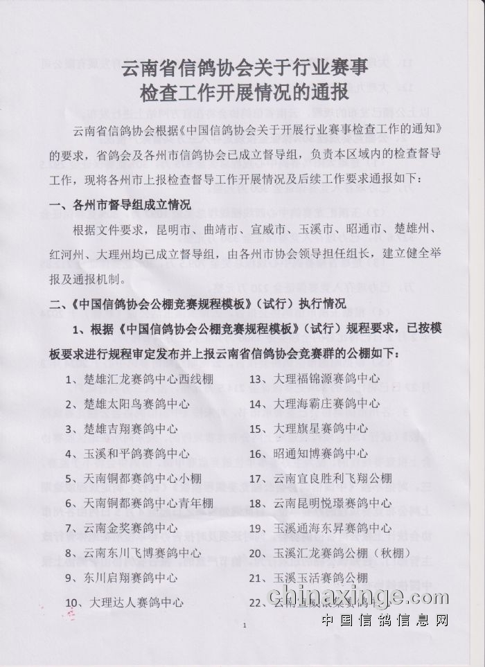 3月28日,云南省信鸽协会发布了《关于行业赛事检查工作开展情况的通报》,对省内23家公棚已按照公棚竞赛模板要求进行规程审定,并在网站里公布了各公棚的竞赛规程。