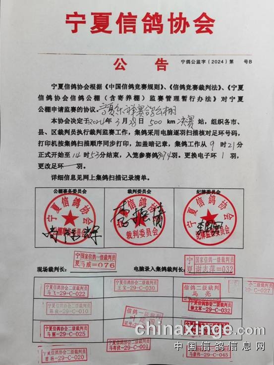 塞上江南、傲翔德赢、万喜公棚三家公棚进行200-300公里级别短距离速度赛,而宁夏乐祥公棚已战至500公里决赛。乐祥公棚在宁夏信鸽协会的监督下,于3月28日上午开始集鸽,共计上笼8074羽赛鸽,预计比赛将于3月29日清晨在陕西蓝田厚镇放飞,空距508公里。
