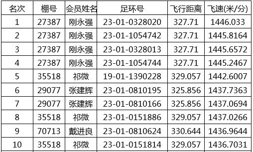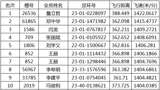 而空距较远的北区,11点05分才决出冠军,是詹立哲的23-01-0228097赛鸽,飞行空距388.449公里,分速1422.0617米/分。邓中华的23-01-1471982、闫龙的23-01-0767817分别获得北区亚军、季军。