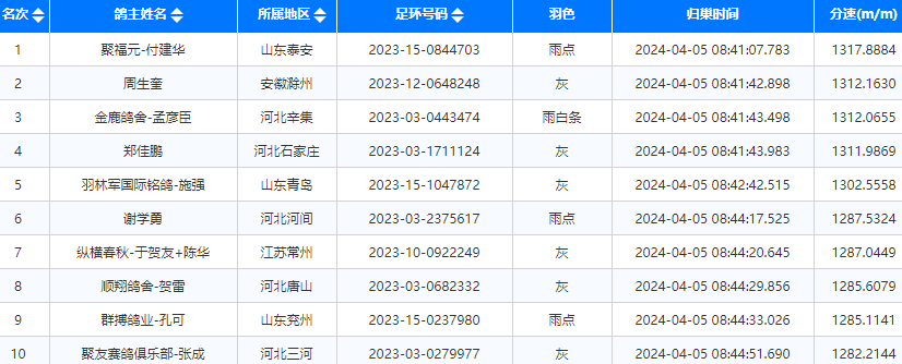上午8点41分,大春棚率先迎来归巢鸽,山东泰安聚福元-付建华的2023-15-0844703雨点鸽获得冠军,分速为1317.8884米/分。安徽滁州周生奎、河北辛集金鹿鸽舍-孟彦臣的赛鸽分别获得亚军、季军。截至上午9点,比赛已归巢超1000羽。