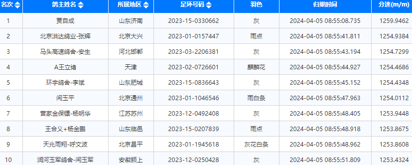 上午8点55分,小春棚冠军归来,是山东济南贾自成的2023-15-0330662灰鸽,飞行分速为1259.9462米/分。北京洪达鸽业-张辉、河北邯郸马头高速鸽舍-安生的赛鸽分别获得亚军、季军,截至上午9点,比赛已报到超700羽。