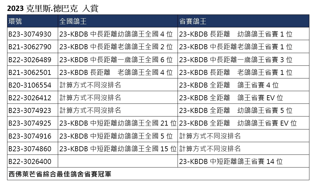 B23-3074925:23-KBDB中短距离幼鸽王全国21位;23-KBDB全距离幼鸽鸽王省赛EV位