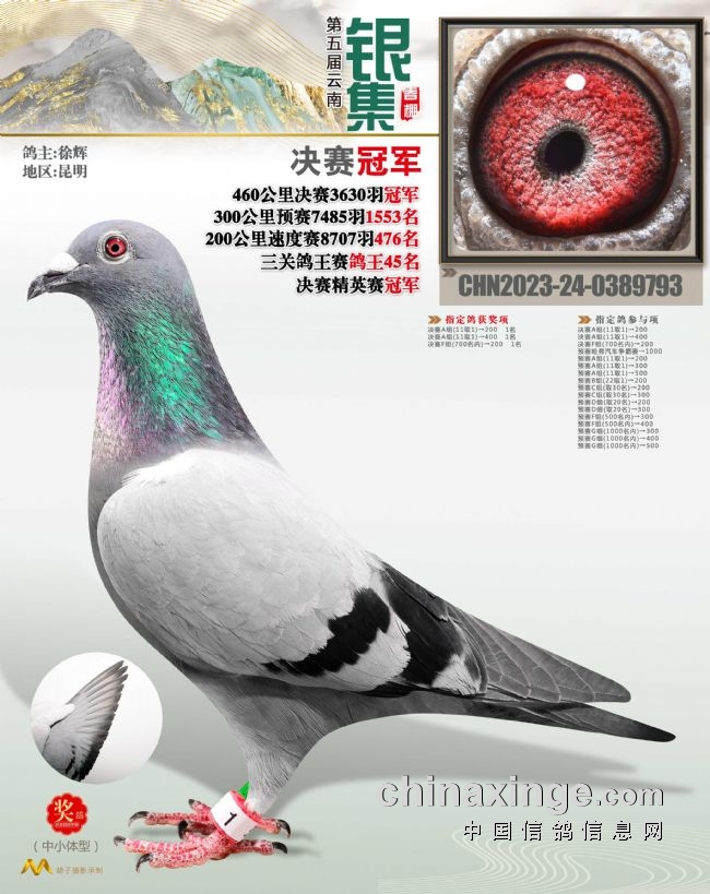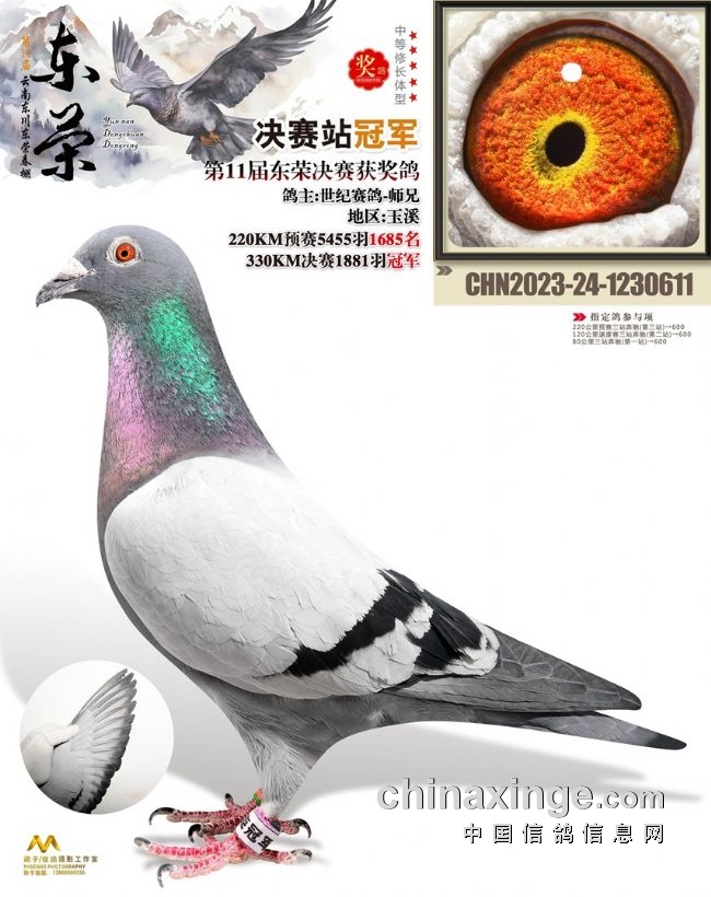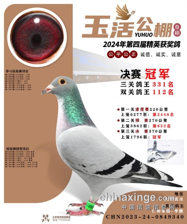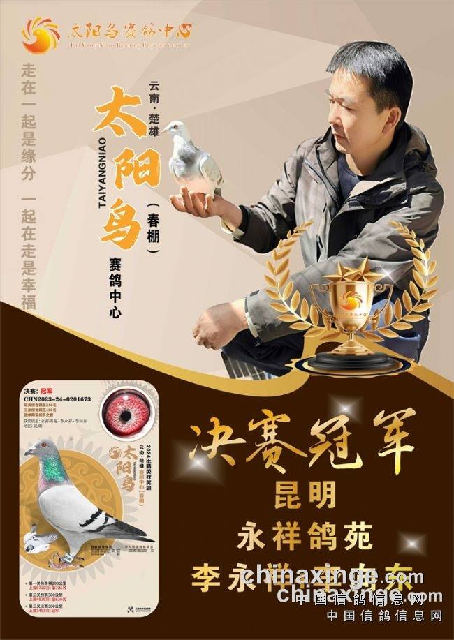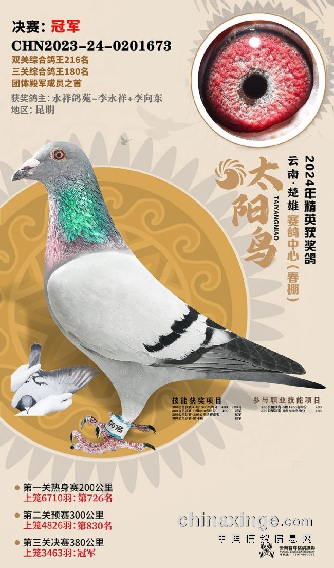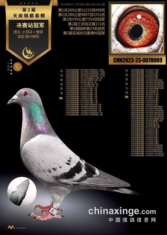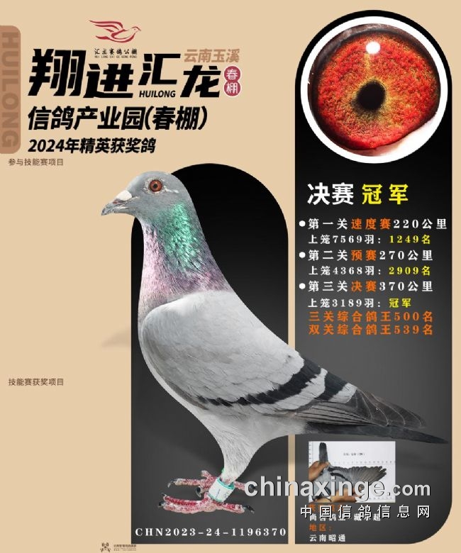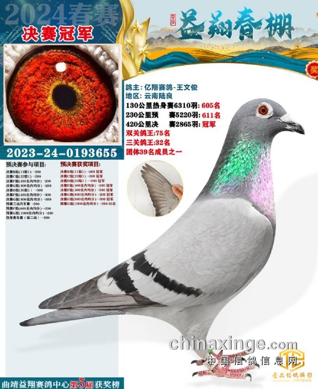10、云南曲靖益翔:艰难赛事夺冠军关关稳定发挥。云南曲靖益翔赛鸽中心春棚第五届春赛,3月12日打响230公里预赛,上笼5220羽,归巢过半。3月25日打响决赛,2865羽上笼,当日仅归490羽赛鸽,当日归巢率不足两成。艰难的赛事,造就实力的王者。在决赛中,亿翔赛鸽-王文俊的一羽2023-24-0193655灰鸽,以五秒优势领先捷足先登,拿下决赛冠军,分速1240.8506米/分。这羽赛鸽在130公里热身赛、230公里预赛均在600多名,十分稳定,决赛一飞冲天夺魁。同时,还拿下双关鸽王75位、三关鸽王32位以及超多指定大奖。