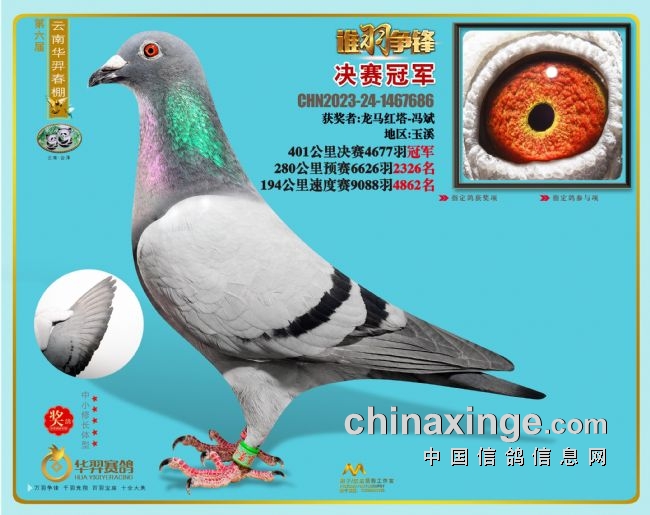 4、云南会泽华羿春棚:拖拉机“黑马”夺冠军。云南会泽华羿春棚第六届400公里决赛站,于3月10日完成集鸽4677羽,3月11日在墨江县通关镇境内放飞,空距401公里。13:12:49.029,首羽赛鸽报到,龙马红塔-冯斌环号2023-24-1467686赛鸽飞出1308.3748米/分,夺下冠军,鸽主是来自玉溪的鸽友,这一羽赛鸽实力演绎“黑马”本色,前两关“拖拉机”,均在几千名,最后一关才拿出看家本领,逆袭夺冠,也难怪鸽主并未给它打上指定。