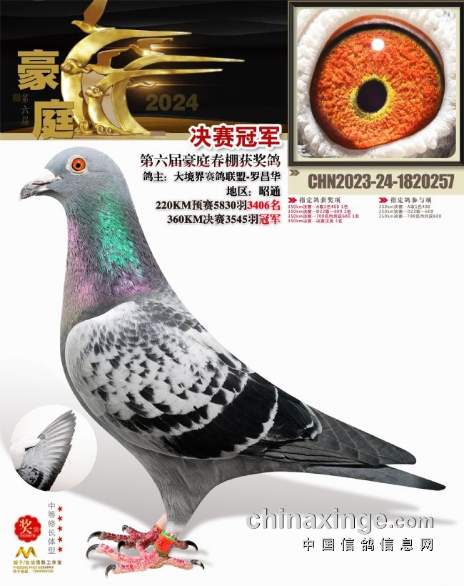 7、云南东川豪庭:黄眼雨点逆袭夺冠。云南东川豪庭赛鸽中心春棚,今年为第六届赛事,收费1600元/羽,收费站上笼10149羽赛鸽,当日归93.57%。2月份先后完成预赛、决赛比拼,2月18日的决赛上笼3545羽,当日归巢878羽。冠军由大境界赛鸽联盟-罗昌华斩获,足环号2023-24-1820257,分速1576.0202米/分。这羽黄眼雨点鸽,同时斩获多项指定冠军大奖。