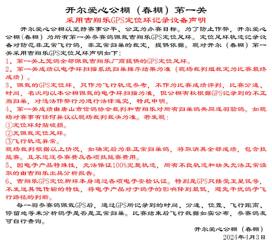 4月7日早上06:32,唐山开尔国际赛鸽爱心公棚(春棚)10818羽赛鸽放飞,参与第一关比赛,司放地辽宁锦州,实际空距307.75公里。为了防止作弊,开尔爱心公棚(春棚)为所有第一关参赛鸽佩戴吉翔乐GPS定位足环。
