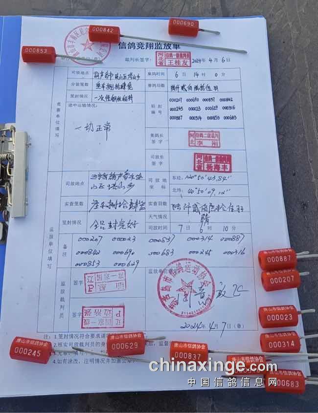 天津宇航春棚2024年第二届春季三关竞赛260-350公里(第一关)于4月6日集鸽,4月7日早晨7点22分开笼,开笼地点:辽宁兴城市,比赛空距295公里,11068羽赛鸽震撼放飞。值得一提的是,为了防止作弊,天津宇航春棚为所有第一关参赛鸽佩戴吉翔乐GPS定位足环,对防范非正常飞行鸽,非正常归巢的裁定,提供依据。
