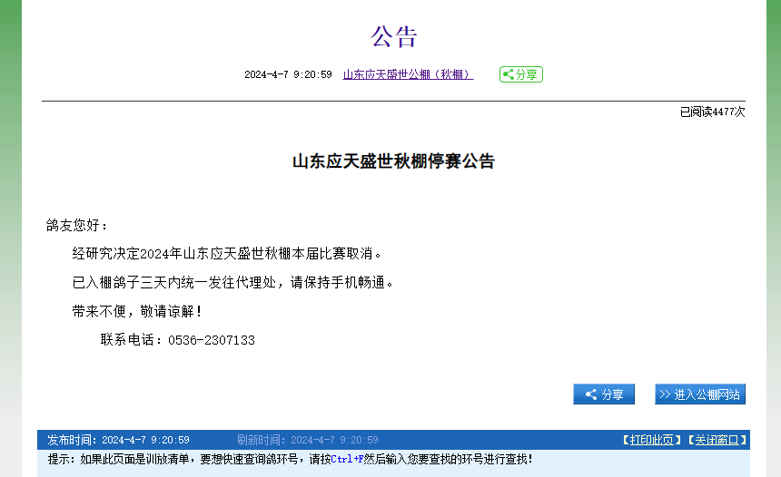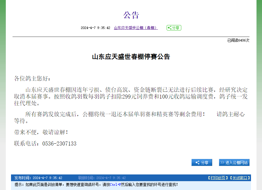 4月7日,山东应天盛世赛鸽公棚发布公告,因连年亏损、债台高筑、资金链断裂,已无法进行比赛,春棚、秋棚同时宣布停赛。