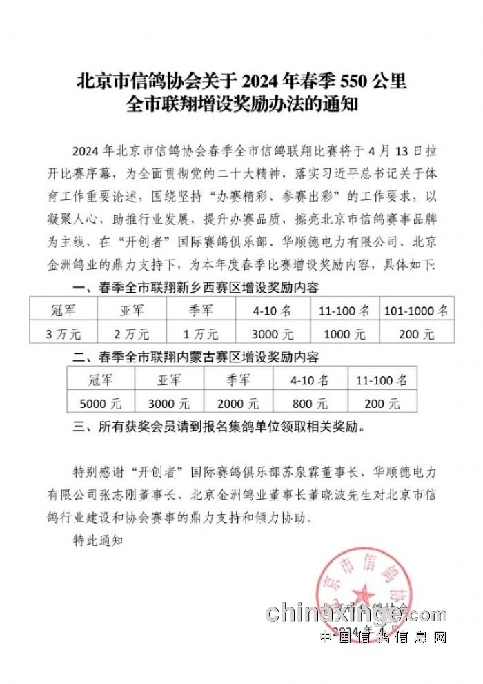 今年的比赛,设南线新乡西、北线内蒙古赛区两项赛事。北京市信鸽协会为了办好赛事,在开创者、华顺德、北京金洲鸽业的鼎力支持下,增设了奖励办法:
